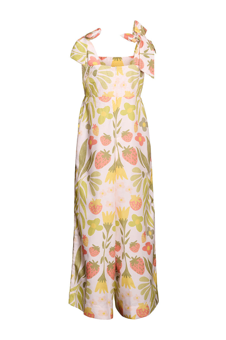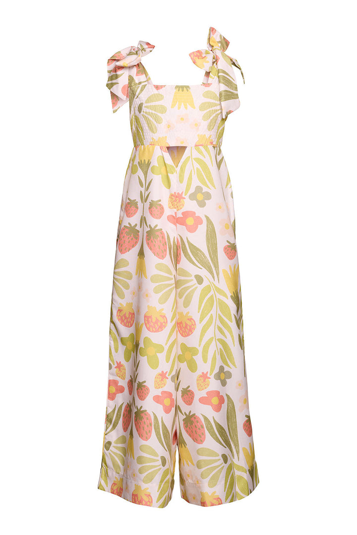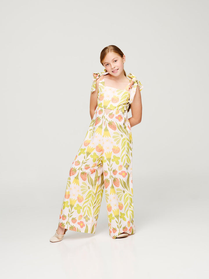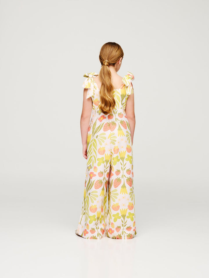 Enhance your kid's wardrobe with the AMARANTA JUMPSUIT KIDS. This elegant and fresh romper features a strawberry print and adjustable sleeves with a cute bow, adding a touch of sweetness and femininity. The ruffled detail and V-shaped designs on the front create a visually appealing effect. The back closure ensures a comfortable and secure fit. Available in our Mommy and Me collection for a coordinated look.