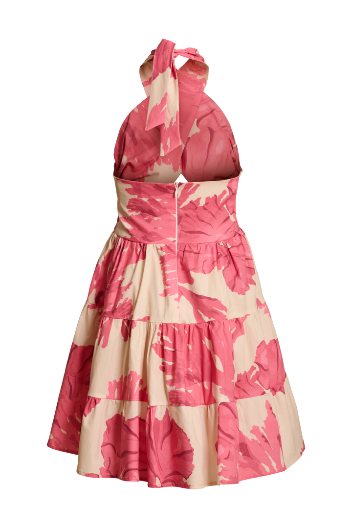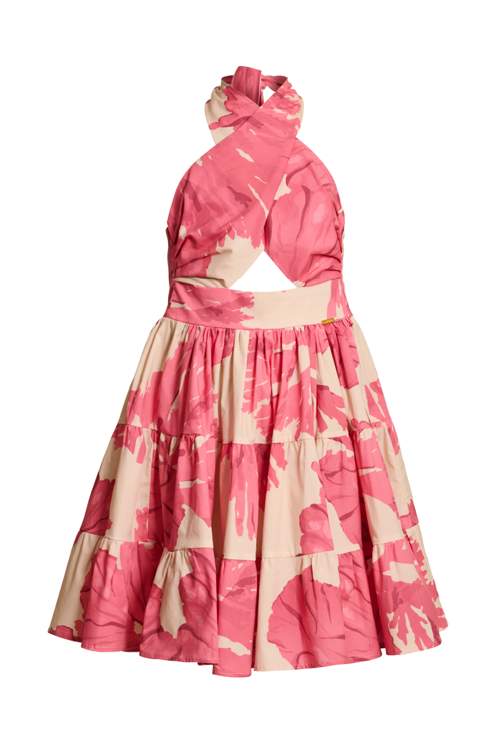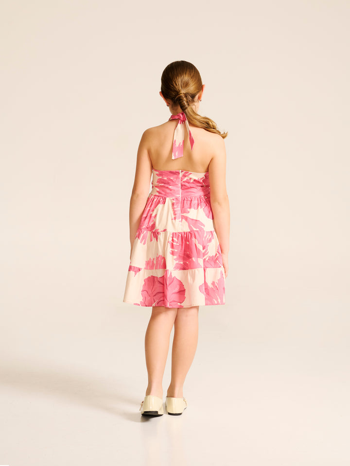 Short dress with a pink and white floral print. Crisscross halterneck at the front and a triangular cutout at the midriff. Available for both moms and girls.