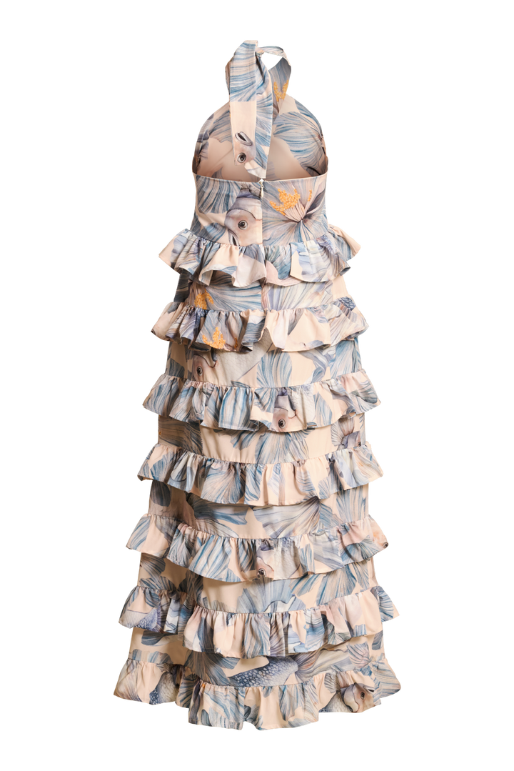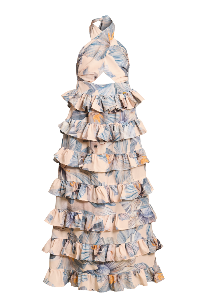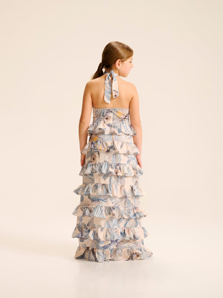 Long dress in a blue and pink print. Sleeveless design with crisscross straps and a triangular neckline at the front. The lower part of the dress is made up of several layers of tiered ruffles that give it a voluminous and romantic look. Available in mother and daughter sizes.