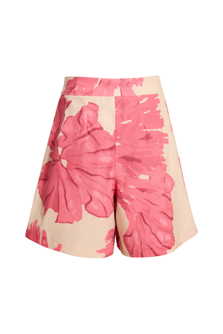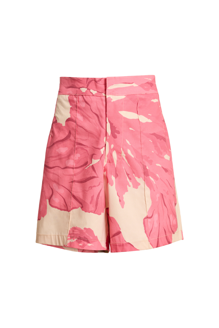 High-waisted shorts with a straight cut, button closure, and visible zipper with vertical pleats at the front. Available for moms and girls.